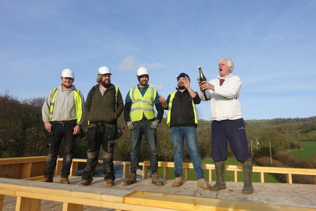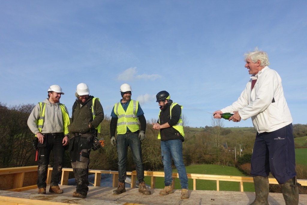 Mark and I prepared food for the event and ensured a good supply of beer, cider and champagne. Sadly due to my foot I was unable to clamber up to the top tower but Mark gamely went up and duly sprayed the roof and the workers with champagne. The builders then signed the beam and all of us imbibed in some drinks and food to celebrate a job incredibly well done by HM Construction. https://www.hmconstructionuk.co.uk