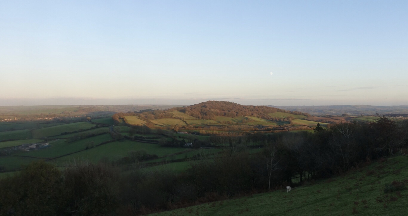Today Mark and I walked up to the top of Lewesdon Hill – the highest point in Dorset with views down to the sea in the South and across to the Somerset levels and Glastonbury Tor to the North.